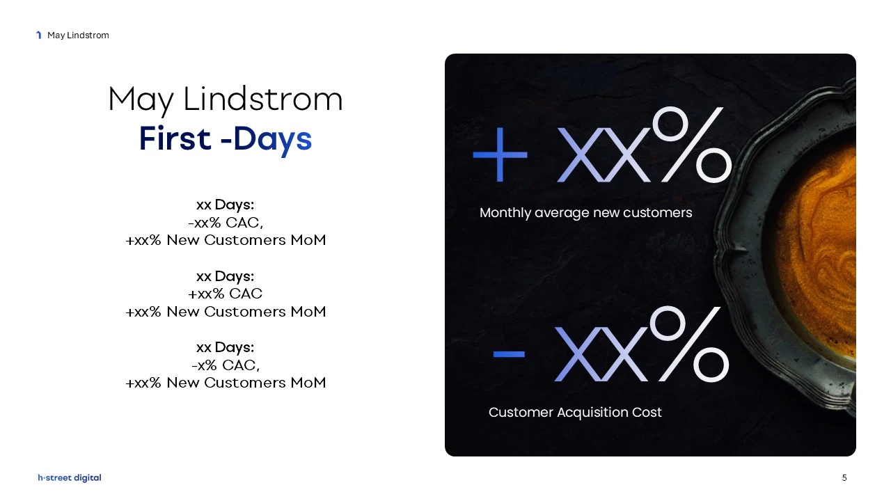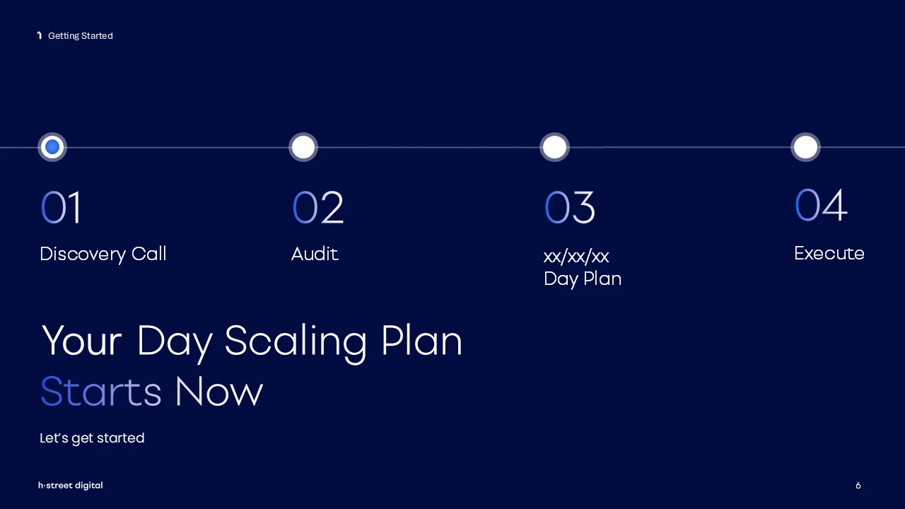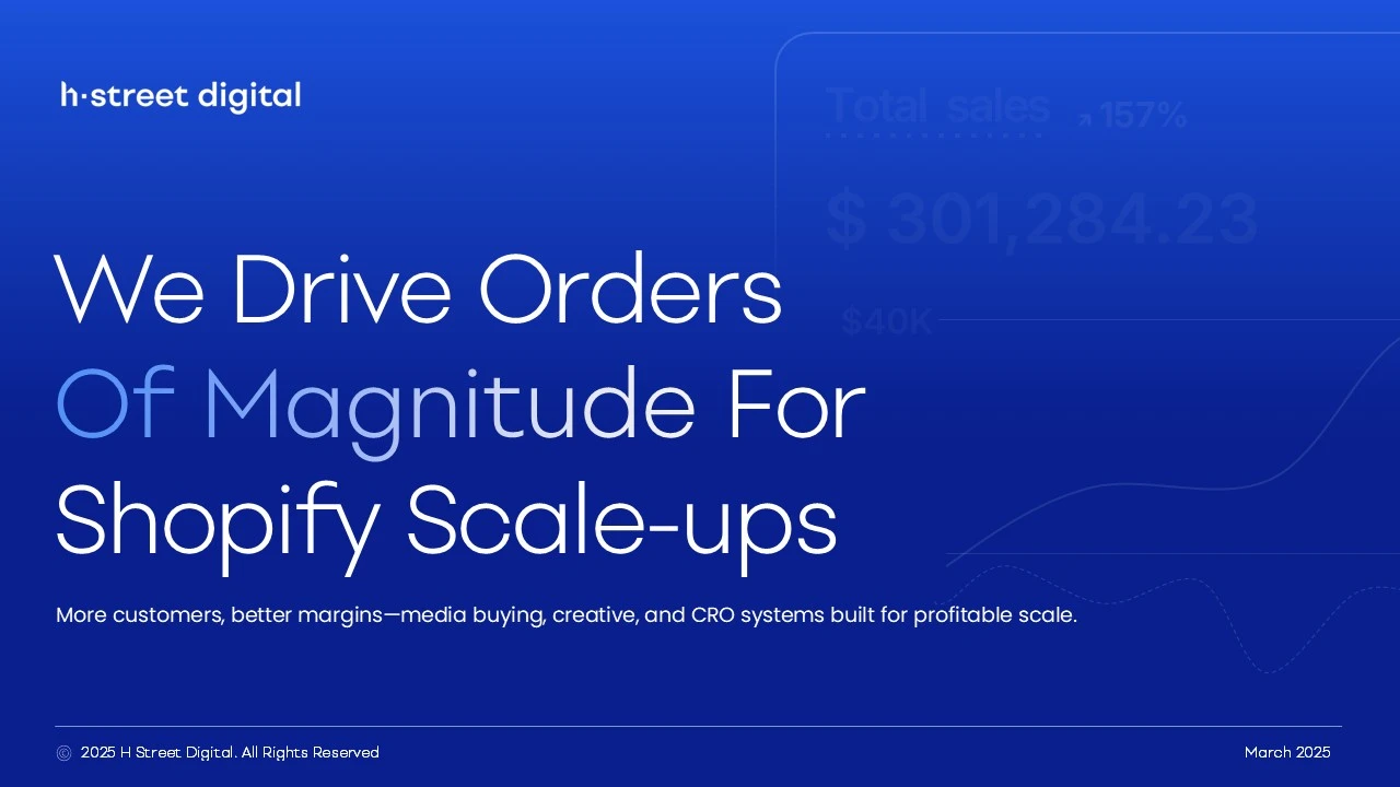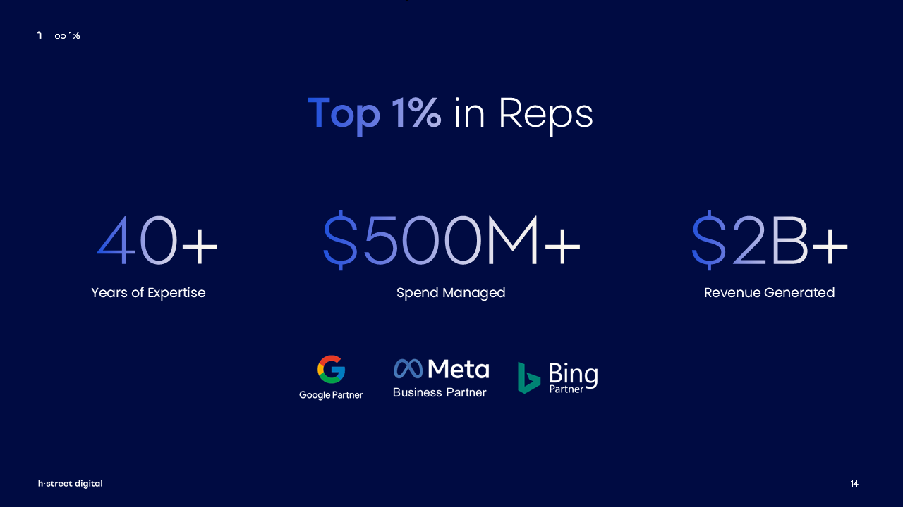 H Street Digital's founding team needed sales decks that matched their innovative agency model. We elevated their blue-themed brand identity with dynamic gradients, custom infographics that simplify their methodology and strategically highlighted KPIs that drive customer conversations.