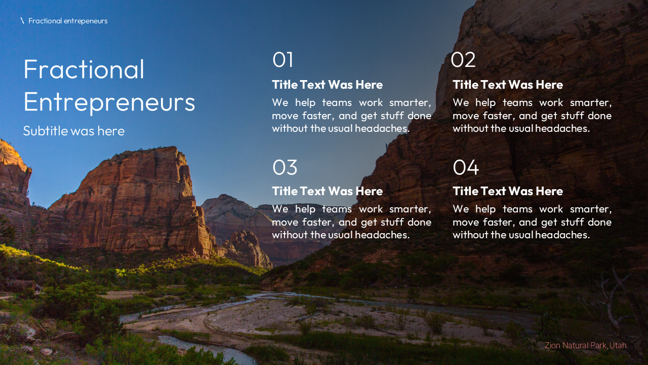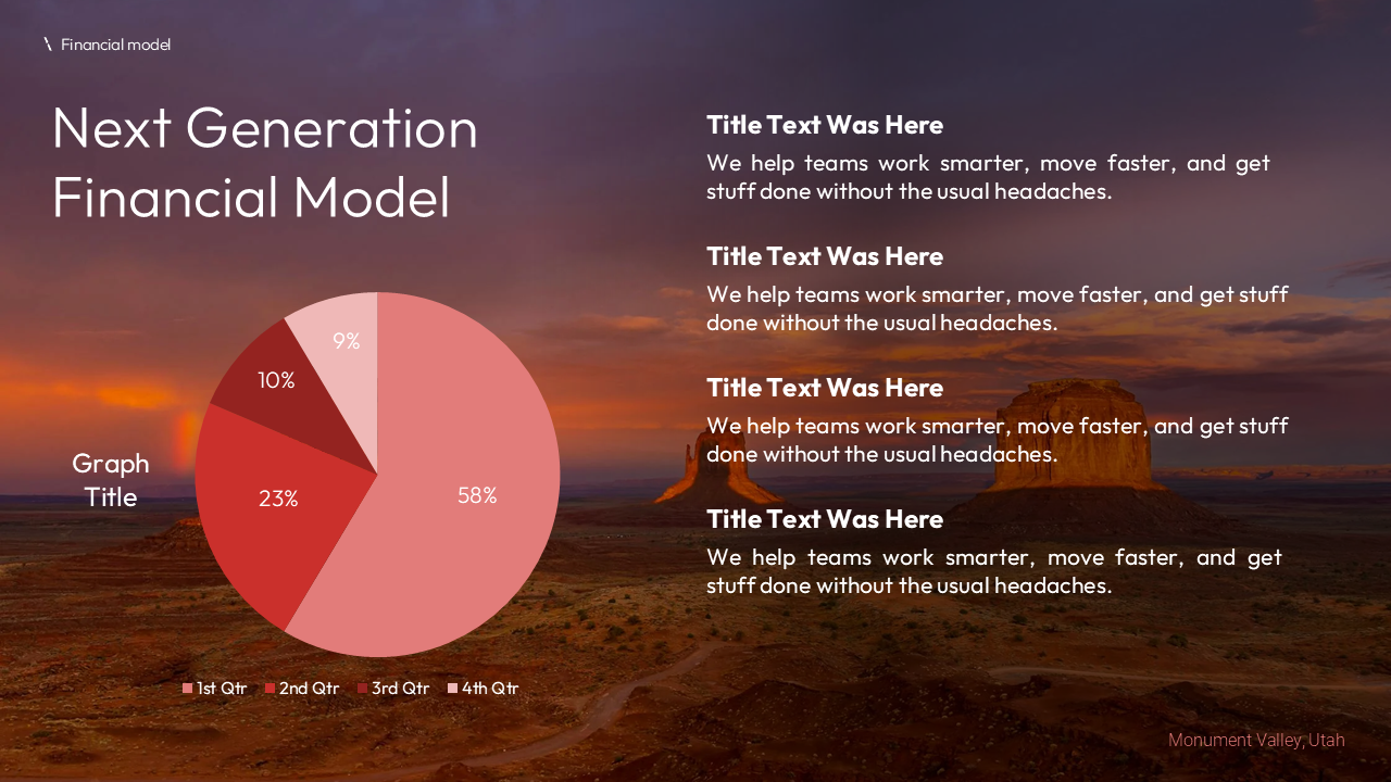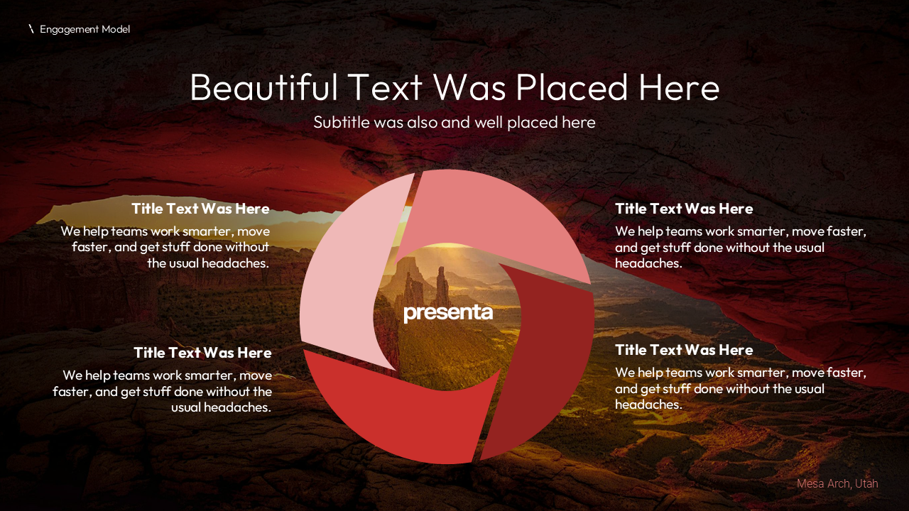 Inspired by the beautiful Intermountain West, we designed the remaining slides with a consistent brand identity featuring rich reds and stunning landscape backgrounds.