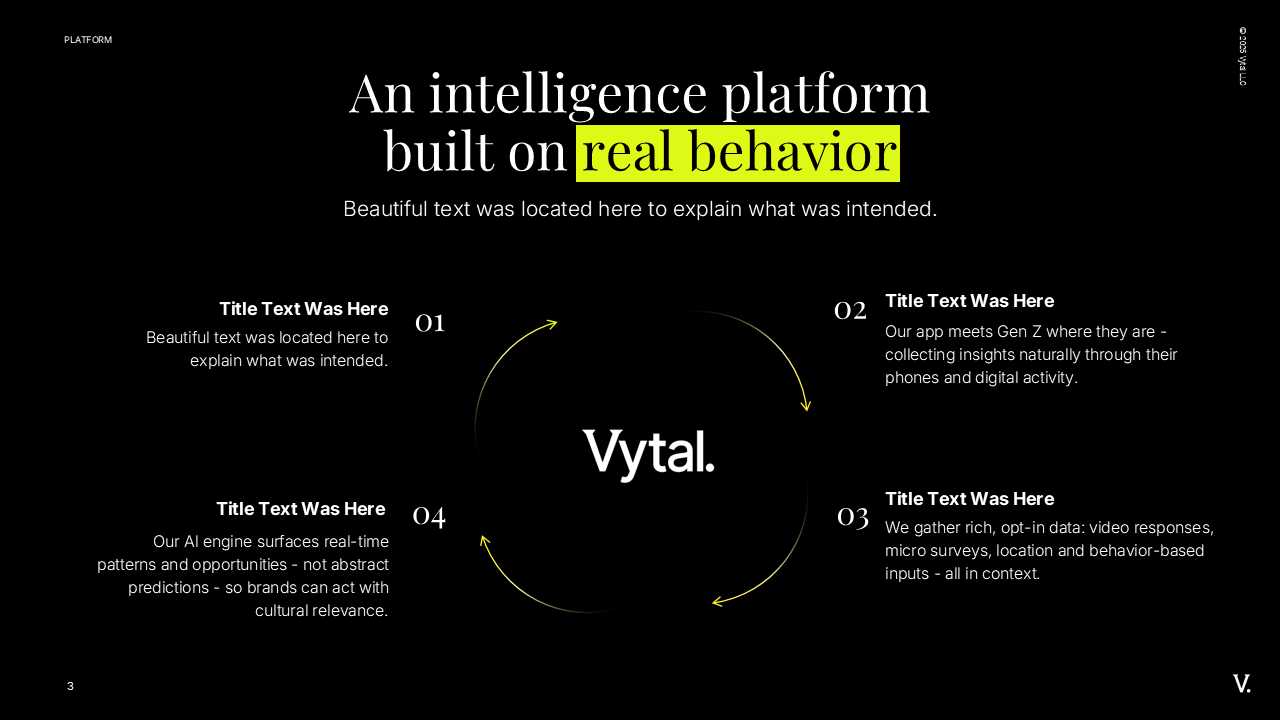 Vytal Voices is a groundbreaking research platform startup. The founding team needed recurrent support in translating their visual outlines in stunning presentations.